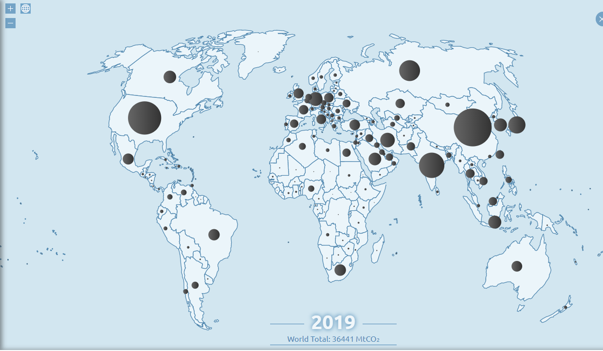 위에 제가 사진으로 걸어둔 세계지도는 글로벌 카본 아틀라스에서 세계 국가별 탄소배출량의 정도를 검은색 원으로 시각화한 것입니다.