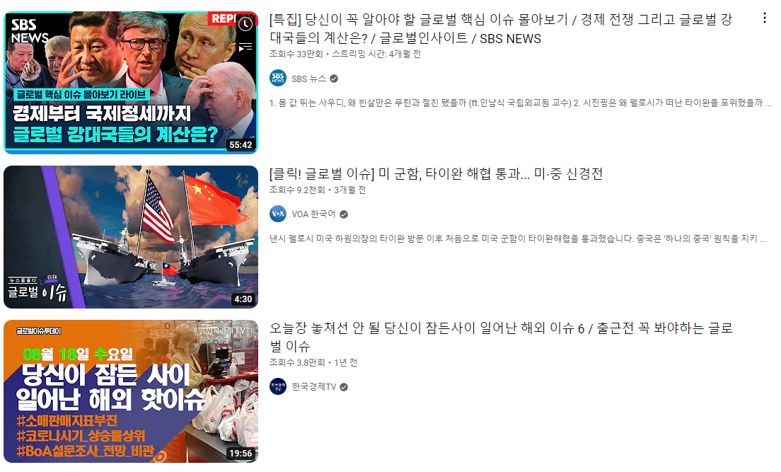 (사진 출처=유튜브, 검색어 키워드 '글로벌 이슈' 사진에 나온 영상 썸네일=유튜브 채널 SBS뉴스, VOA 한국어, 한국경제TV)